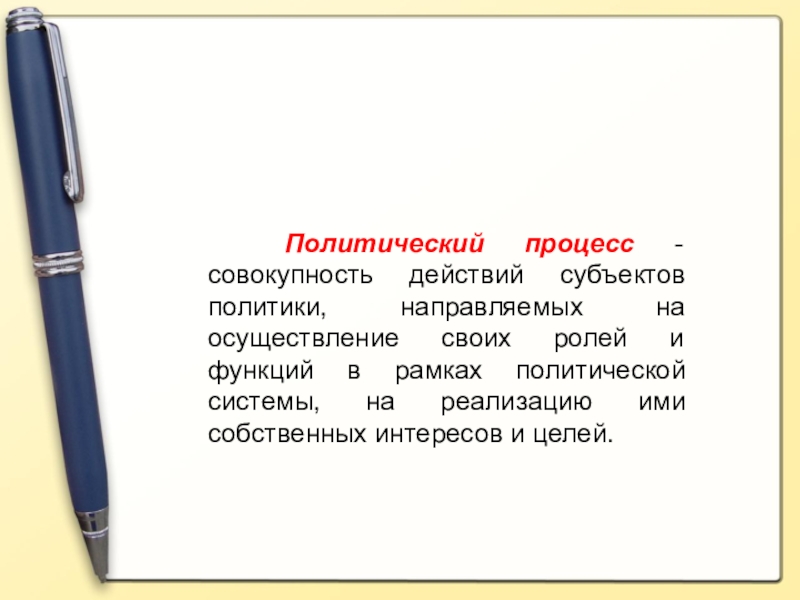 Слайд 4 Политический процесс - совокупность действий субъектов политики, направляемых на