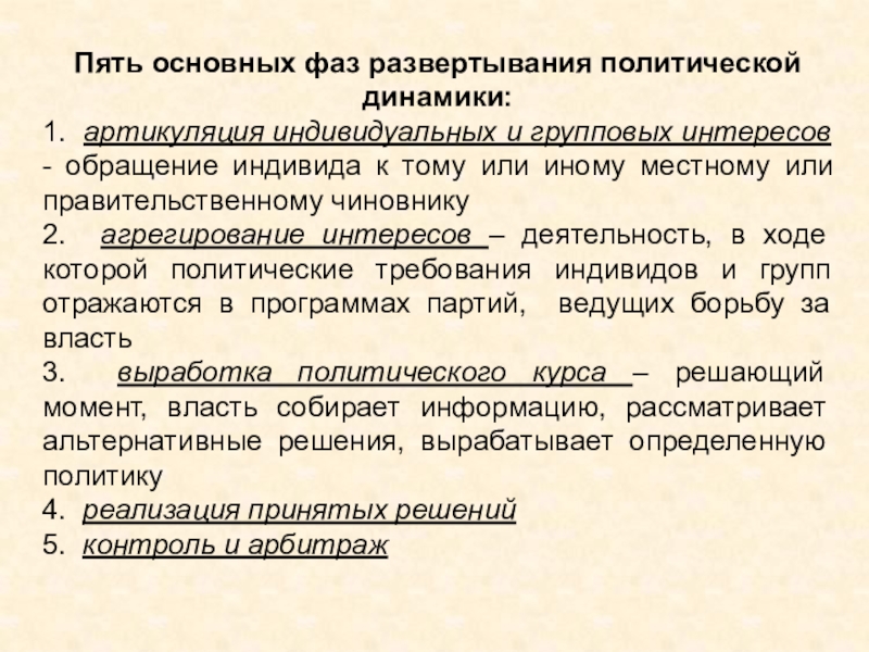 Слайд 7Пять основных фаз развертывания политической динамики: