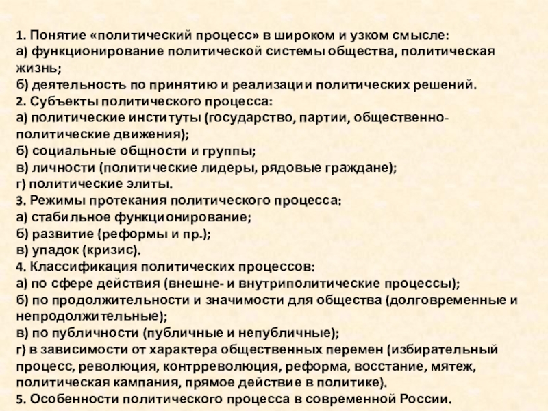 Слайд 31. Понятие «политический процесс» в широком и узком смысле: