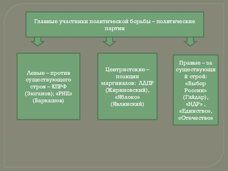 Правые – за существующий строй: «Выбор России» (Гайдар), «НДР» , «Единство», «Отечество»