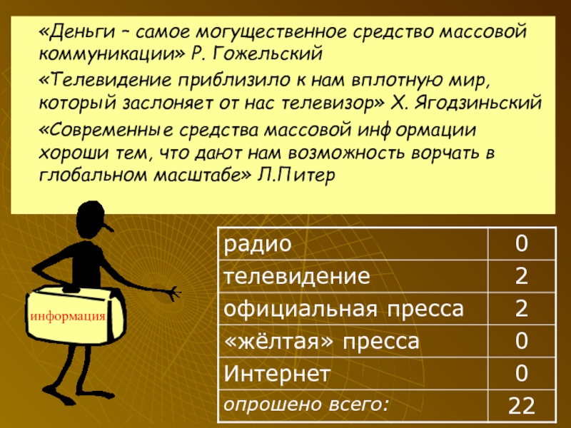 совокупность каналов распространения информации, адресованной неограниченному кругу лиц, социальных групп, государств, с целью оперативного информирования их относительно событий и явлений в мире, регионе, а также для выполнения специфических функций