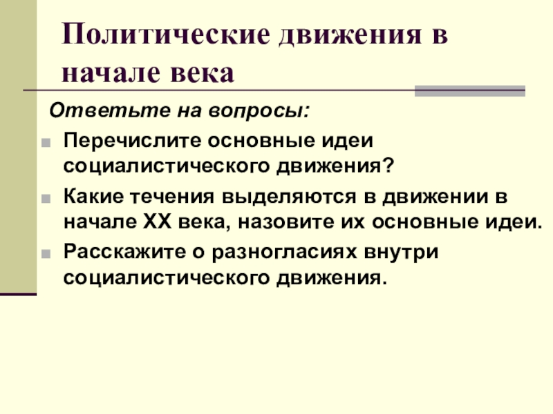 Политические движения в начале века Ответьте на вопросы:Перечислите основные идеи социалистического движения?Какие течения выделяются в движении в начале