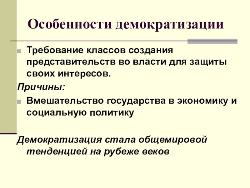 Особенности демократизацииТребование классов создания представительств во власти для защиты своих интересов.Причины:Вмешательство государства в экономику и социальную политикуДемократизация