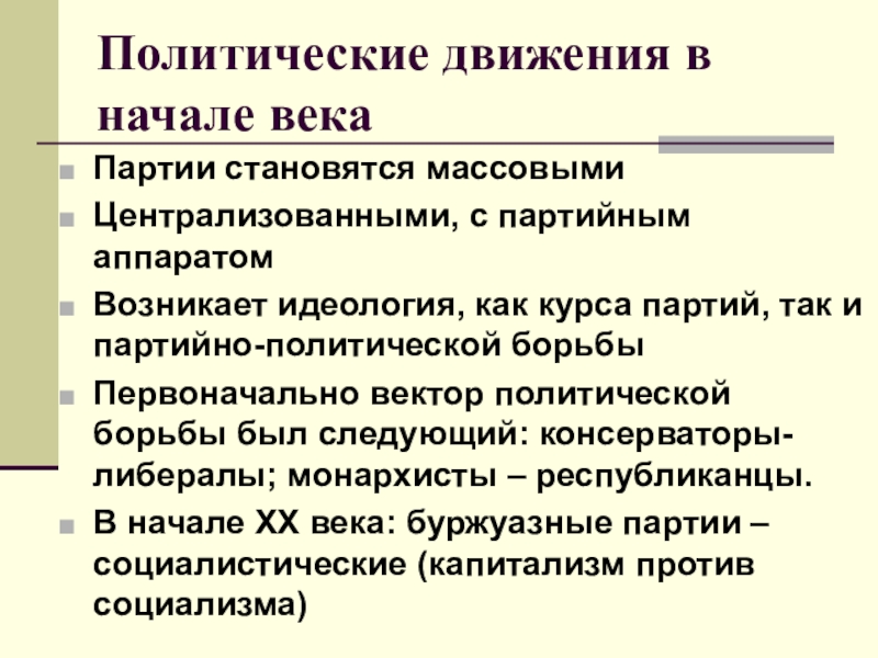 Политические движения в начале векаПартии становятся массовымиЦентрализованными, с партийным аппаратомВозникает идеология, как курса партий, так и партийно-политической