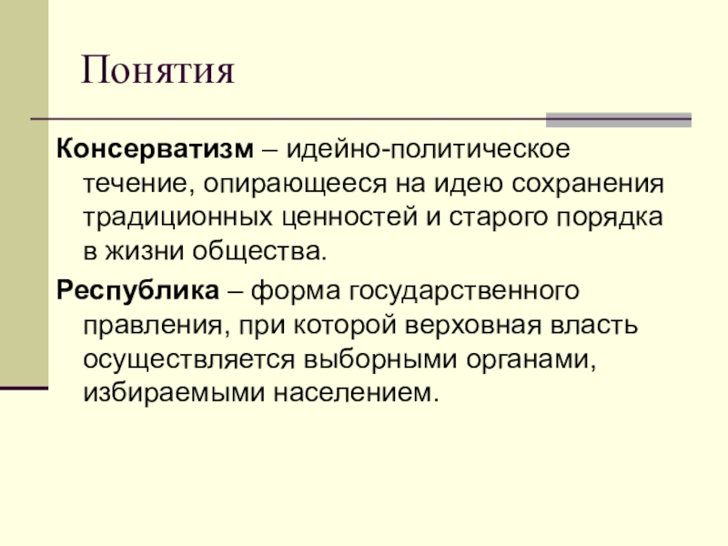 ПонятияКонсерватизм – идейно-политическое течение, опирающееся на идею сохранения традиционных ценностей и старого порядка в жизни общества.Республика –