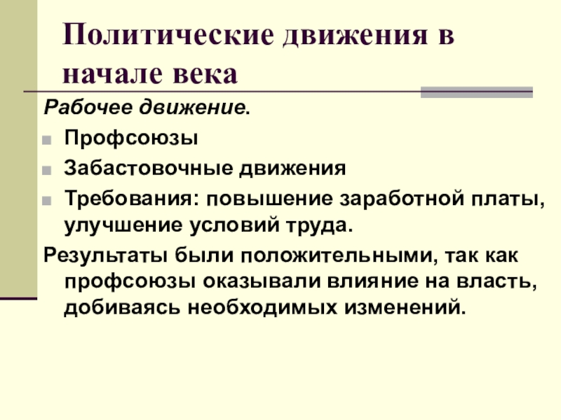 Политические движения в начале векаРабочее движение.ПрофсоюзыЗабастовочные движенияТребования: повышение заработной платы, улучшение условий труда.Результаты были положительными, так как