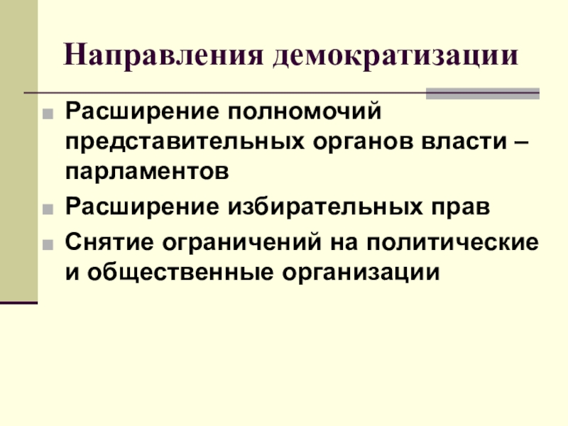Направления демократизацииРасширение полномочий представительных органов власти – парламентовРасширение избирательных правСнятие ограничений на политические и общественные организации