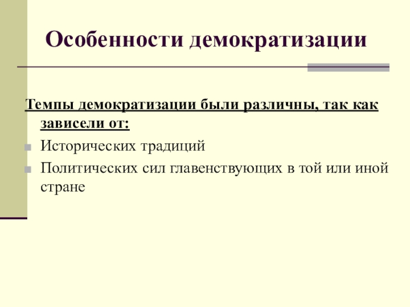 Особенности демократизацииТемпы демократизации были различны, так как зависели от:Исторических традиций Политических сил главенствующих в той или иной