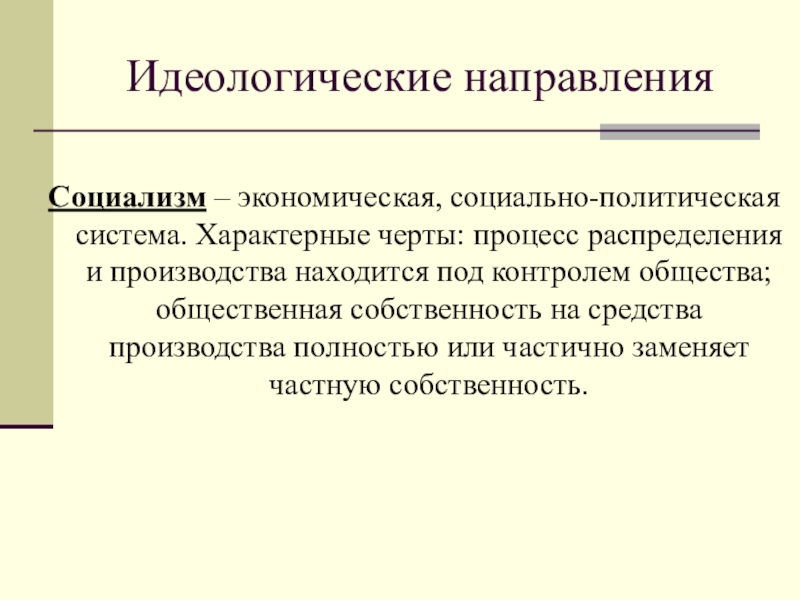 Идеологические направленияСоциализм – экономическая, социально-политическая система. Характерные черты: процесс распределения и производства находится под контролем общества; общественная