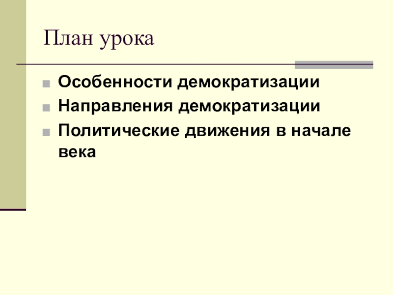 План урокаОсобенности демократизацииНаправления демократизацииПолитические движения в начале века