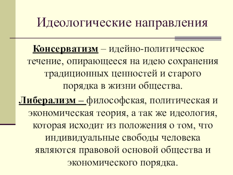 Идеологические направленияКонсерватизм – идейно-политическое течение, опирающееся на идею сохранения традиционных ценностей и старого порядка в жизни общества.Либерализм