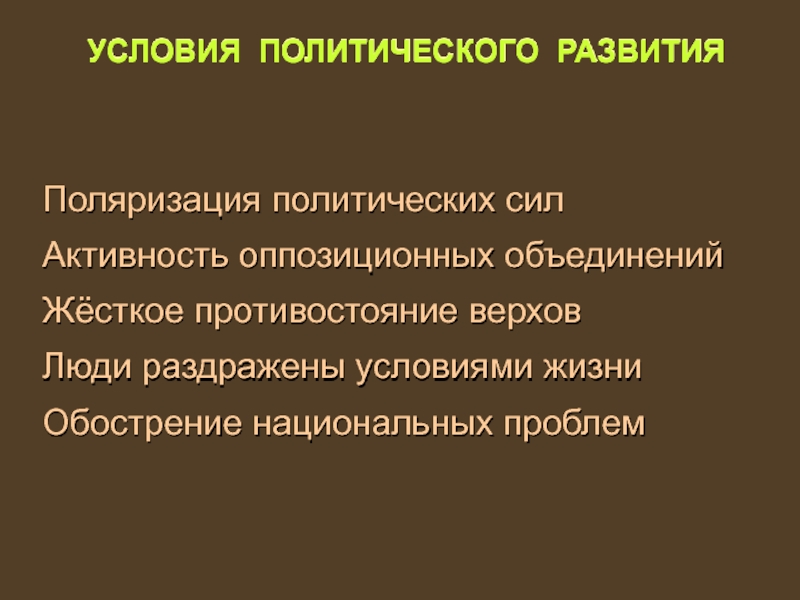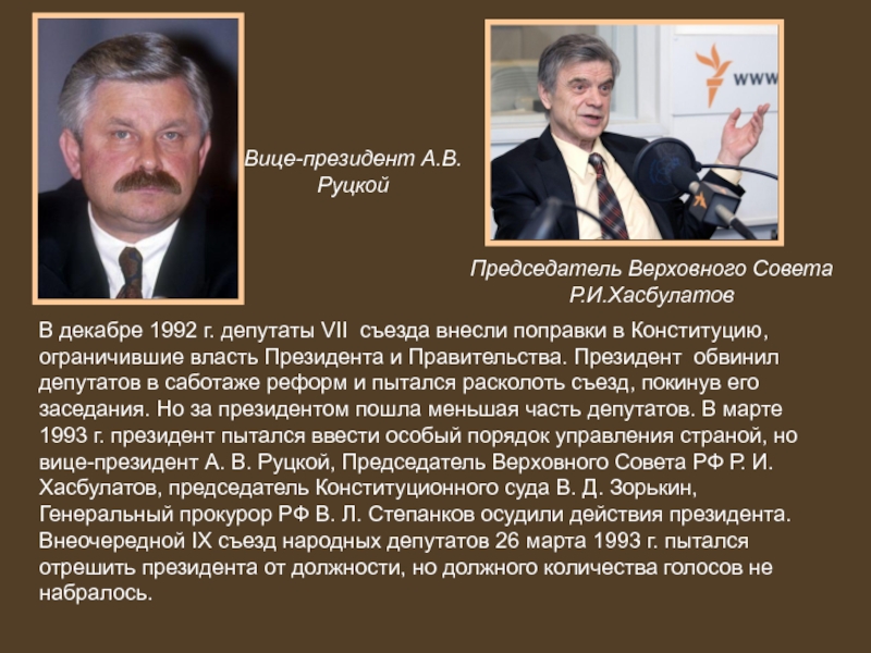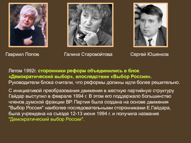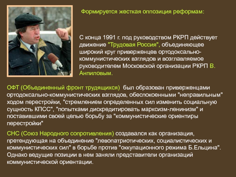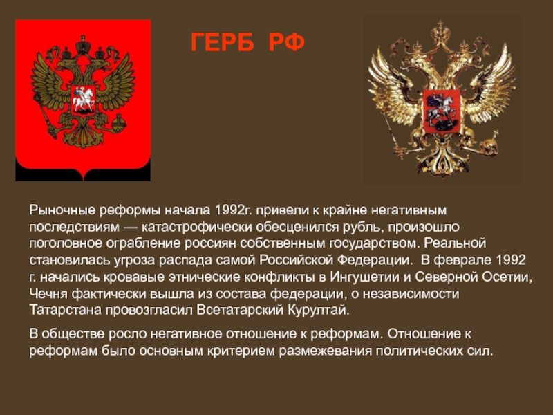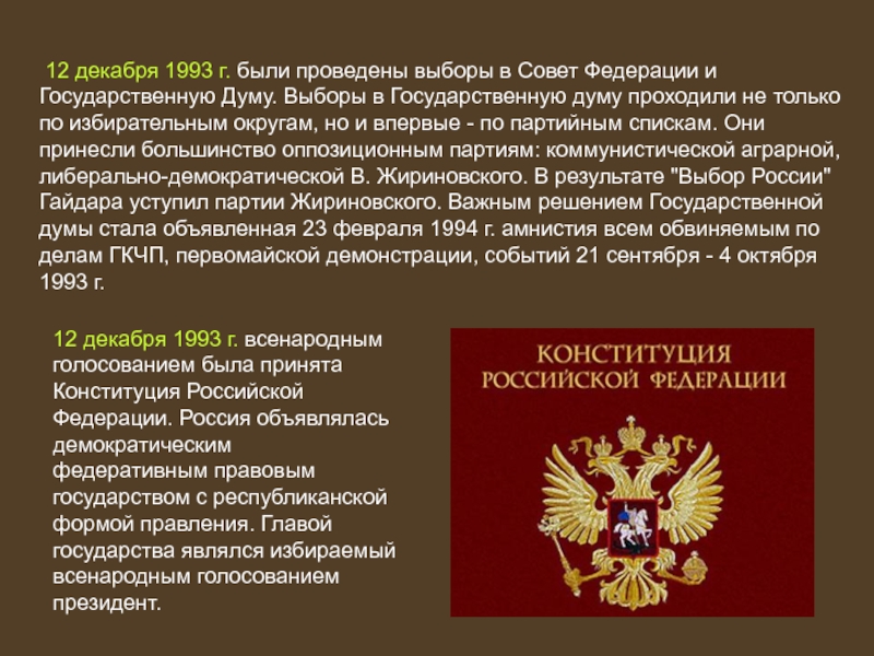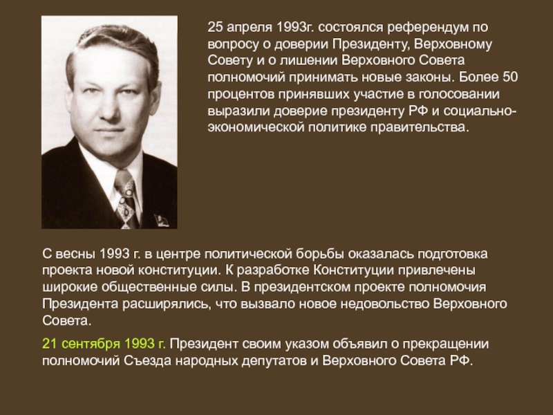 После критического выступления на Пленуме ЦК в октябре 1987 г.снят с этих постов. В 1989 г. при поддержке демократического движения избран народным депутатом СССР, в 1990 г. - народным депутатом РСФСР. В 1990 г. вышел из партии. В 1990-1991 гг. председатель Верховного Совета РСФСР. Первый президент Российской Федерации (избран 12.6.1991; избран на второй срок 3.7.1996). Во время Августовского кризиса 1991 возглавил сопротивление ГКЧП. В декабре 1991 г. подписал Беловежские соглашения.8 декабря 1991 г. был ликвидирован Советский Союз. Россия как правопреемник Советского государства вступала в новый 1992 год уже как самостоятельный субъект права.