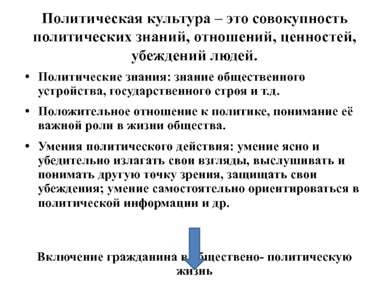 Слайд 30Политическая культура – это совокупность политических знаний, отношений, ценностей, убеждений