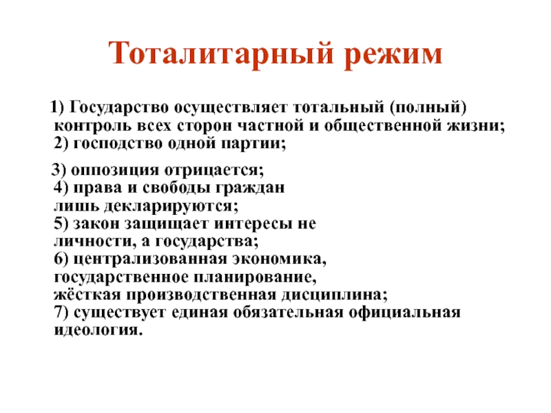3) оппозиция отрицается; 4) права и свободы граждан лишь декларируются; 5) закон защищает интересы не личности, а государства; 6) централизованная экономика, государственное планирование, жёсткая производственная дисциплина; 7) существует единая обязательная официальная идеология.