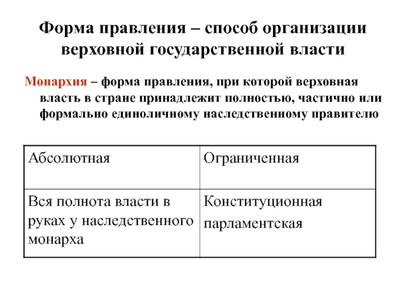 Слайд 8Форма правления – способ организации верховной государственной власти