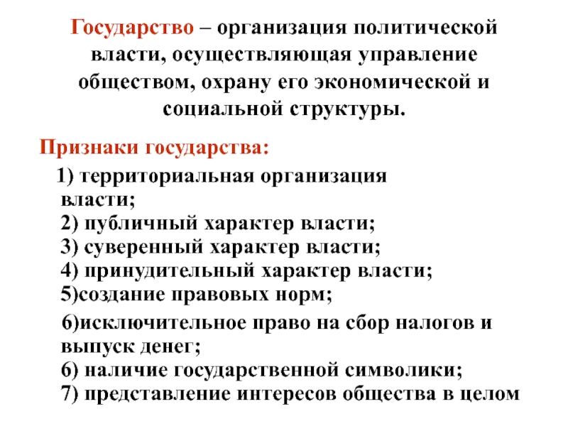 6)исключительное право на сбор налогов и выпуск денег; 6) наличие государственной символики; 7) представление интересов общества в целом