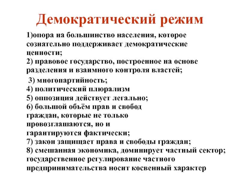 3) многопартийность; 4) политический плюрализм 5) оппозиция действует легально; 6) большой объём прав и свобод граждан, которые не только провозглашаются, но и гарантируются фактически; 7) закон защищает права и свободы граждан; 8) смешанная экономика, доминирует частный сектор; государственное регулирование частного предпринимательства носит косвенный характер