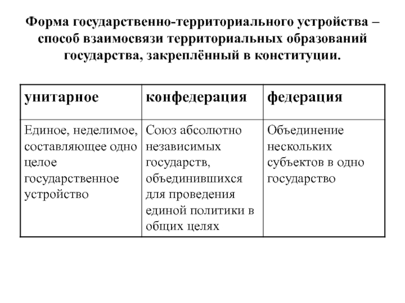 Форма государственно-территориального устройства – способ взаимосвязи территориальных образований государства, закреплённый