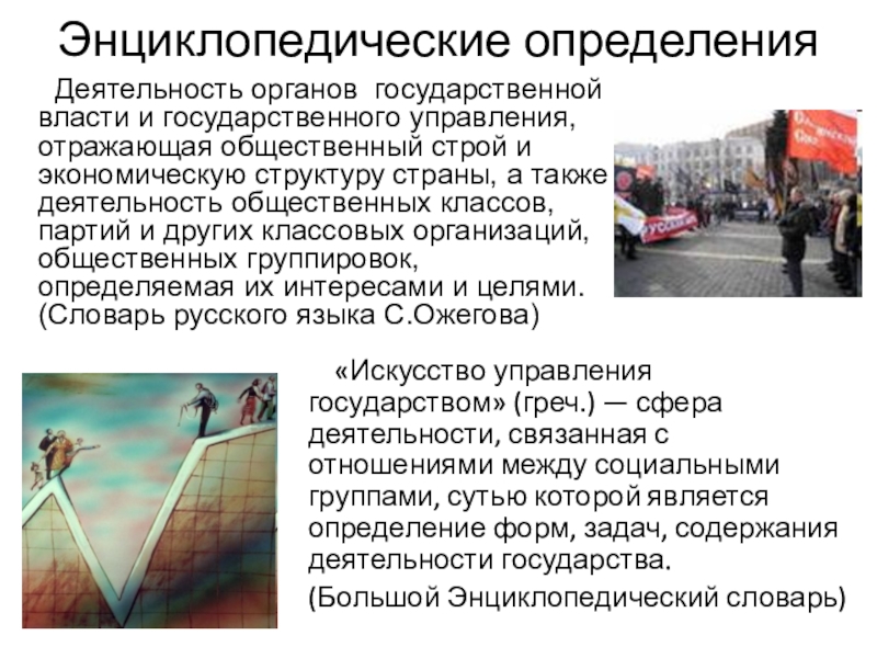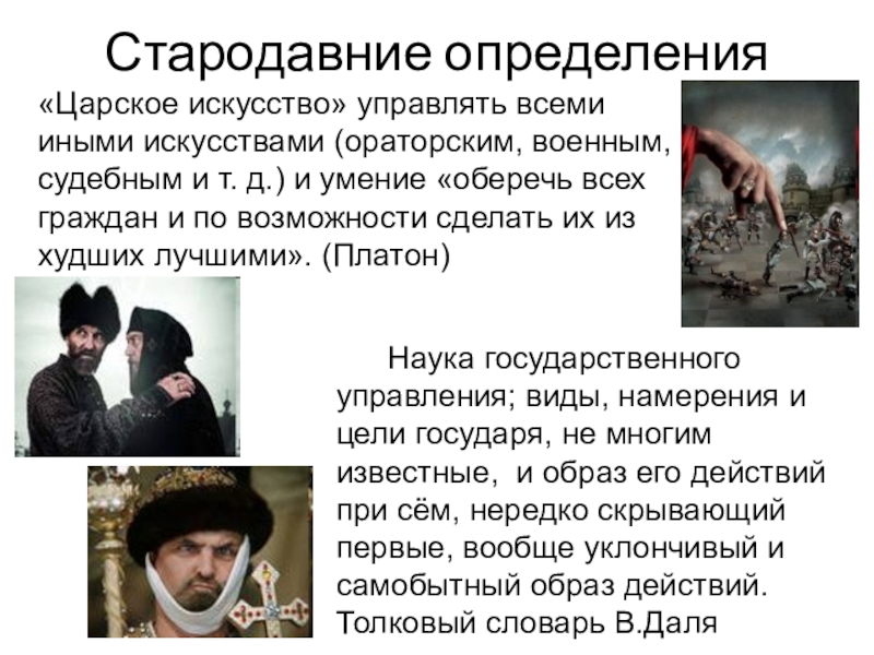 первые, вообще уклончивый и самобытный образ действий. Толковый словарь В.Даля«Царское искусство» управлять всеми иными искусствами (ораторским, военным, судебным и т. д.) и умение «оберечь всех граждан и по возможности сделать их из худших лучшими». (Платон)