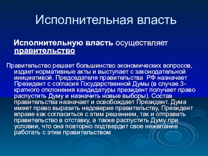 инициативой. Председателя правительства РФ назначает Президент с согласия Государственной Думы (в случае 3-кратного отклонения кандидатуры президент получает право распустить Думу и назначить новые выборы). Состав правительства назначает и освобождает Президент. Дума имеет право выразить недоверие правительству, Президент вправе как согласиться с этим решением, так и отправить правительство в отставку, а также распустить Думу при условии, что она повторно подтвердит свое нежелание работать с этим правительством