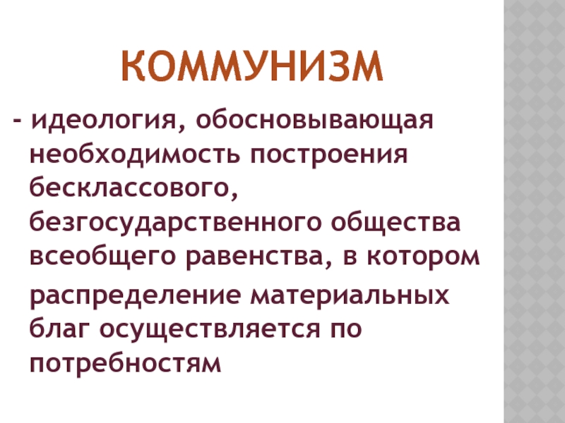 - идеология, обосновывающая необходимость построения бесклассового, безгосударственного общества всеобщего равенства,