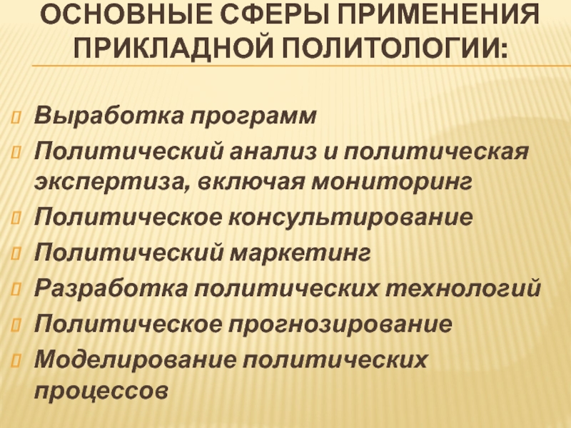 Слайд 205Основные сферы применения прикладной политологии: