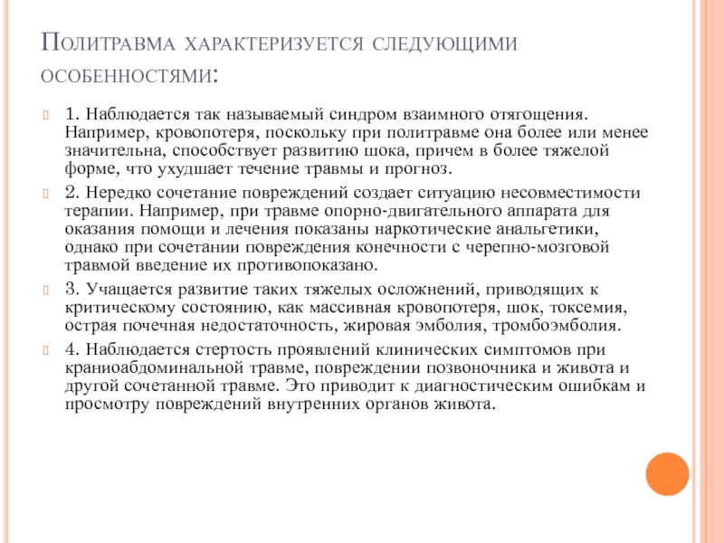 2. Нередко сочетание повреждений создает ситуацию несовместимости терапии. Например, при травме опорно-двигательного аппарата для оказания помощи и лечения показаны наркотические анальгетики, однако при сочетании повреждения конечности с черепно-мозговой травмой введение их противопоказано.