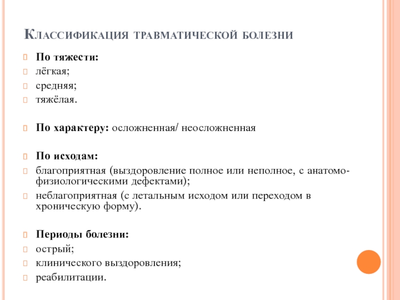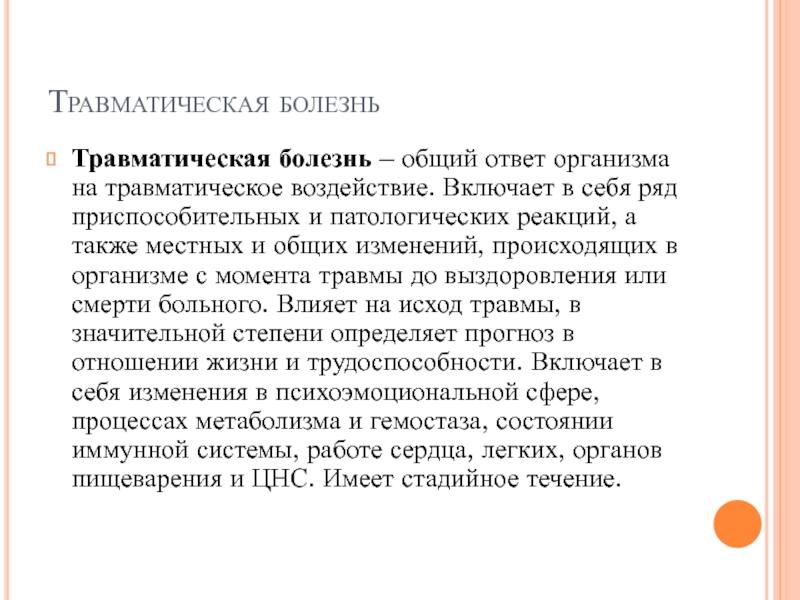Травматическая болезнь – общий ответ организма на травматическое воздействие. Включает