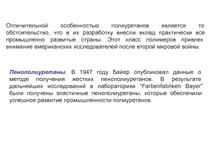 Слайд 19Отличительной особенностью полиуретанов является то обстоятельство, что в их разработку