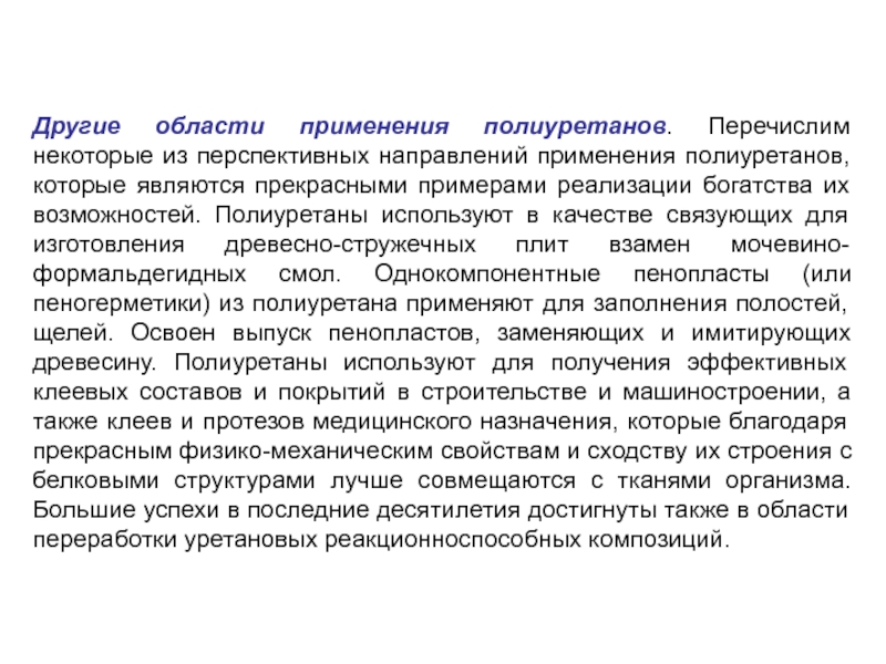 используют в качестве связующих для изготовления древесно-стружечных плит взамен мочевино-формальдегидных смол. Однокомпонентные пенопласты (или пеногерметики) из полиуретана применяют для заполнения полостей, щелей. Освоен выпуск пенопластов, заменяющих и имитирующих древесину. Полиуретаны используют для получения эффективных клеевых составов и покрытий в строительстве и машиностроении, а также клеев и протезов медицинского назначения, которые благодаря прекрасным физико-механическим свойствам и сходству их строения с белковыми структурами лучше совмещаются с тканями организма. Большие успехи в последние десятилетия достигнуты также в области переработки уретановых реакционноспособных композиций.
