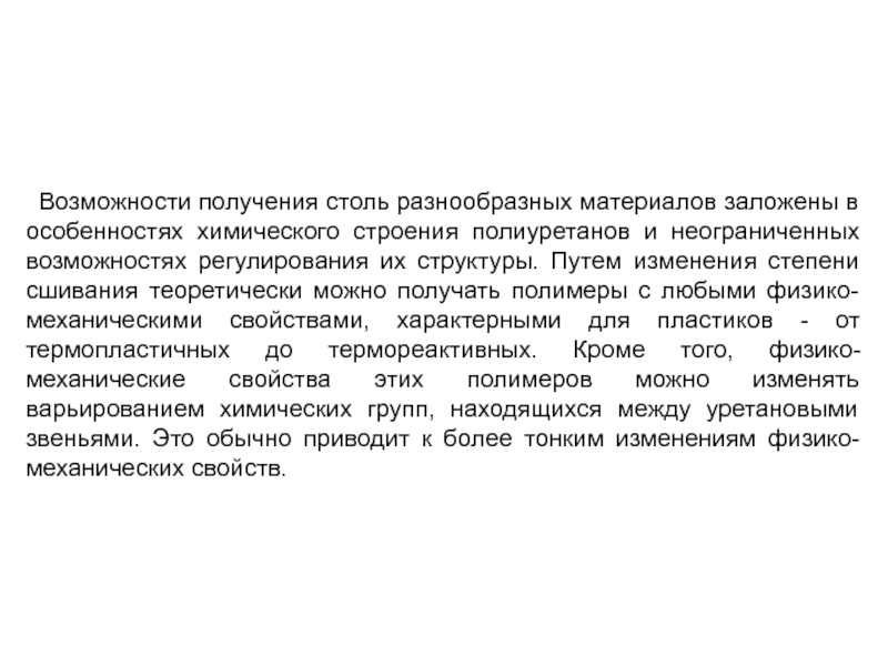 сшивания теоретически можно получать полимеры с любыми физико-механическими свойствами, характерными для пластиков - от термопластичных до термореактивных. Кроме того, физико-механические свойства этих полимеров можно изменять варьированием химических групп, находящихся между уретановыми звеньями. Это обычно приводит к более тонким изменениям физико-механических свойств.
