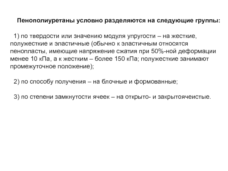 Слайд 22 Пенополиуретаны условно разделяются на следующие группы: