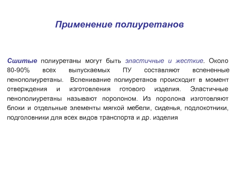в момент отверждения и изготовления готового изделия. Эластичные пенополиуретаны называют поролоном. Из поролона изготовляют блоки и отдельные элементы мягкой мебели, сиденья, подлокотники, подголовники для всех видов транспорта и др. изделия