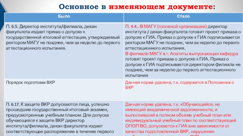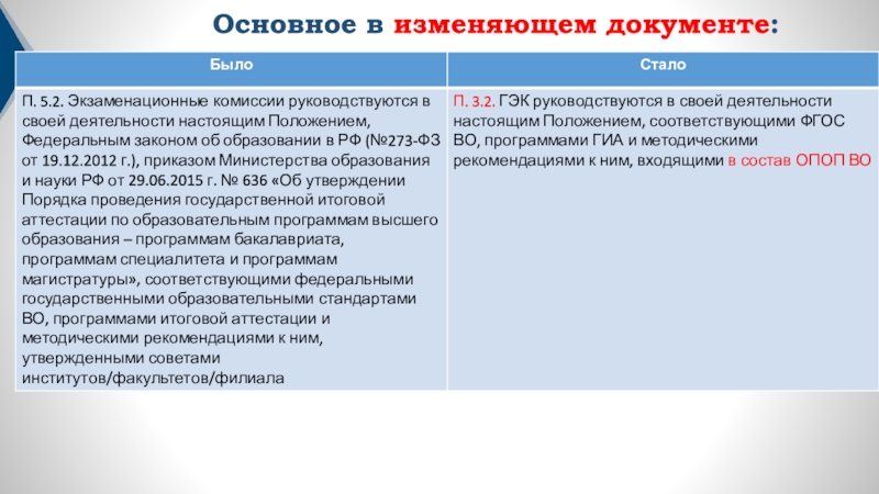 Слайд 2Основное в изменяющем документе: