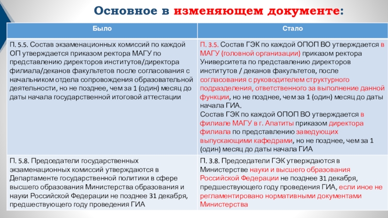 Слайд 3Основное в изменяющем документе: