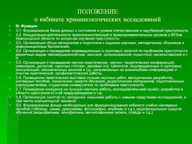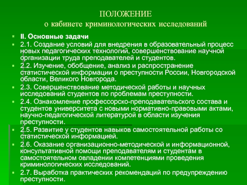 1.1. Кабинет криминологических исследований создается с целью создания условий для совершенствования процесса изучения и познания преступности.