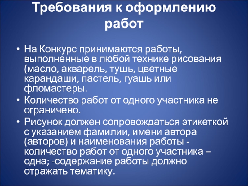 Рисунок должен сопровождаться этикеткой с указанием фамилии, имени автора (авторов) и наименования работы -количество работ от одного участника – одна; -содержание работы должно отражать тематику.