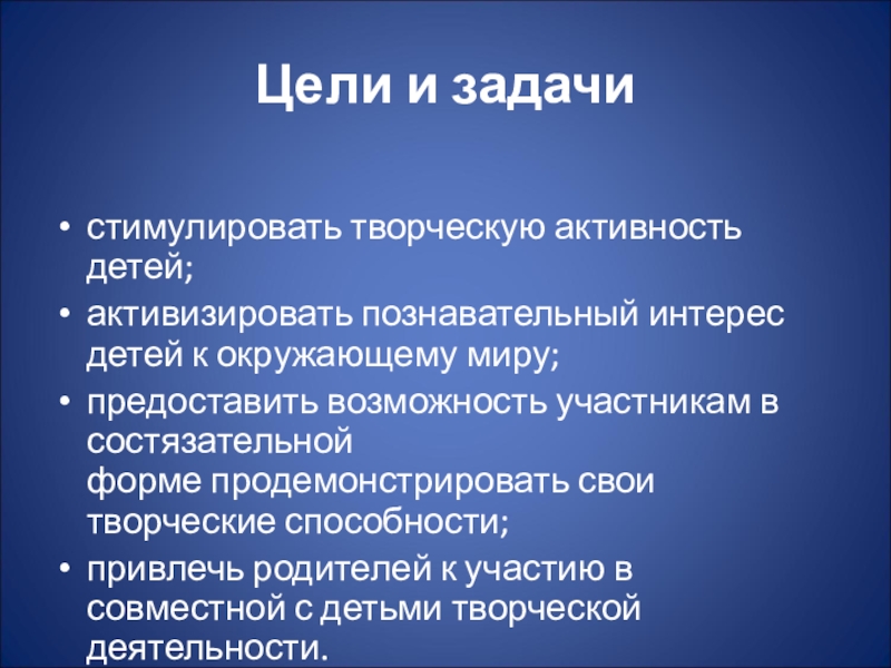 предоставить возможность участникам в состязательной форме продемонстрировать свои творческие способности;
