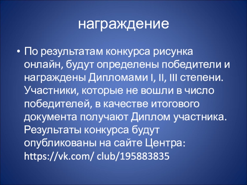 число победителей, в качестве итогового документа получают Диплом участника. Результаты конкурса будут опубликованы на сайте Центра: https://vk.com/ club/195883835