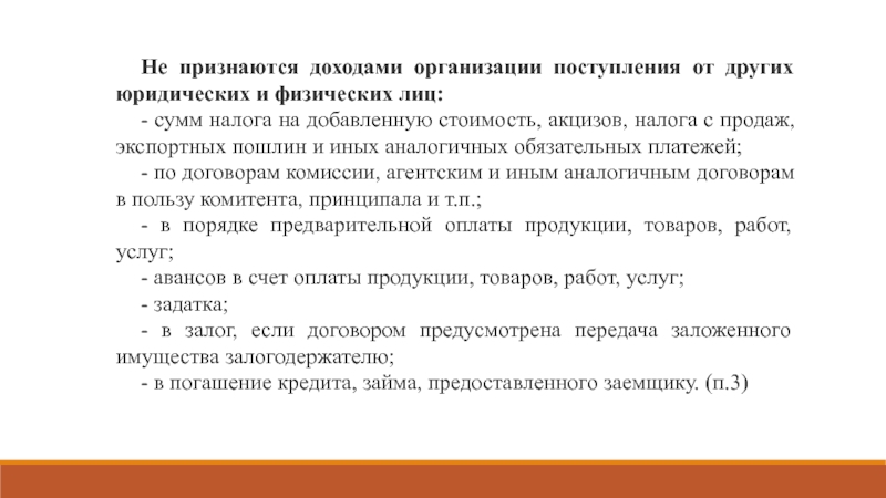 Слайд 3Не признаются доходами организации поступления от других юридических и физических