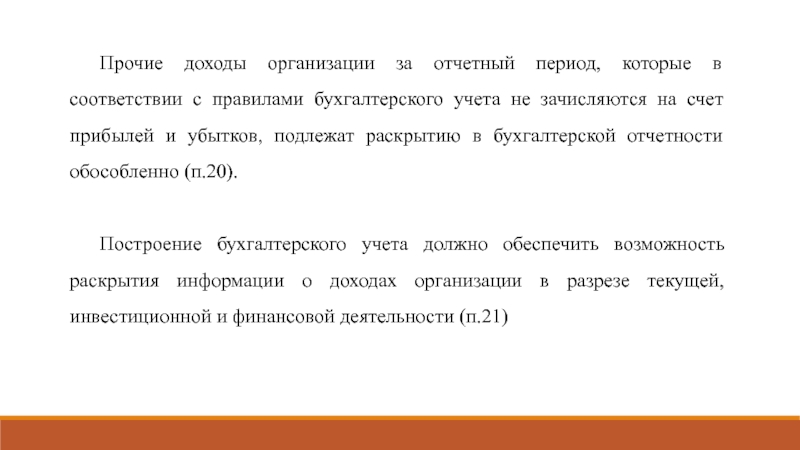 Построение бухгалтерского учета должно обеспечить возможность раскрытия информации о доходах организации в разрезе текущей, инвестиционной и финансовой деятельности (п.21)