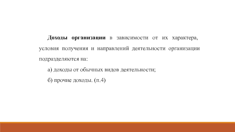 Слайд 4Доходы организации в зависимости от их характера, условия получения и