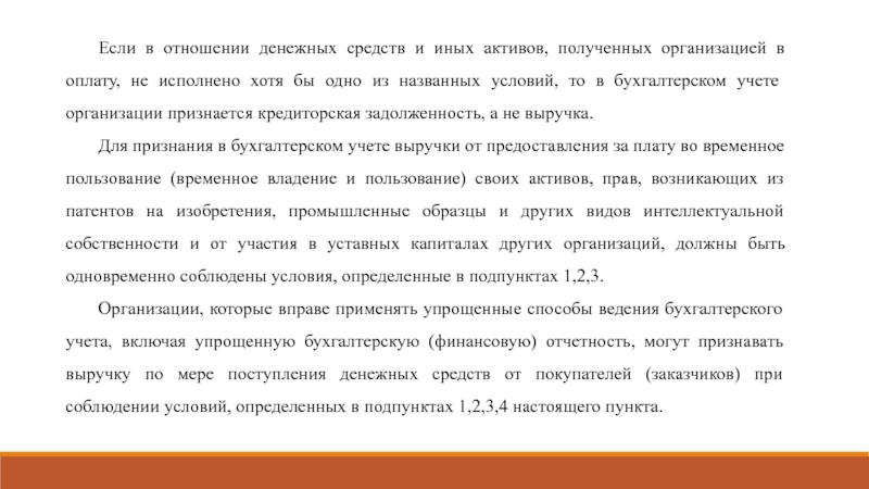 Организации, которые вправе применять упрощенные способы ведения бухгалтерского учета, включая упрощенную бухгалтерскую (финансовую) отчетность, могут признавать выручку по мере поступления денежных средств от покупателей (заказчиков) при соблюдении условий, определенных в подпунктах 1,2,3,4 настоящего пункта.