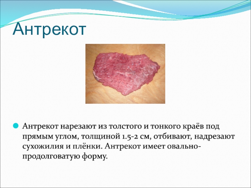 толщиной 1.5-2 см, отбивают, надрезают сухожилия и плёнки. Антрекот имеет