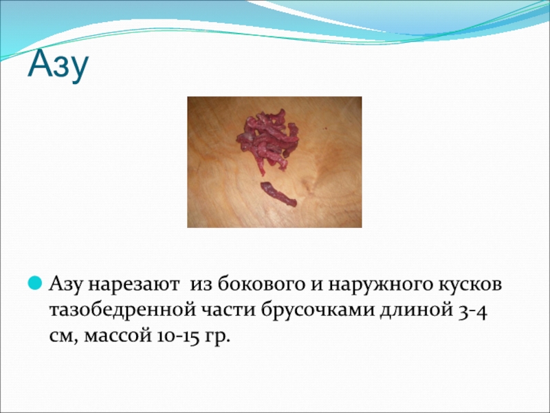 Азу нарезают из бокового и наружного кусков тазобедренной части брусочками