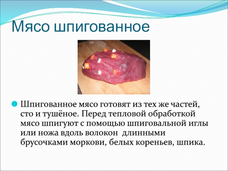 Слайд 8Мясо шпигованное