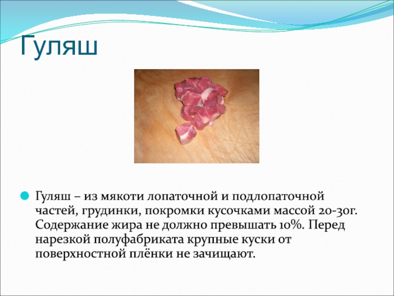 Гуляш – из мякоти лопаточной и подлопаточной частей, грудинки,