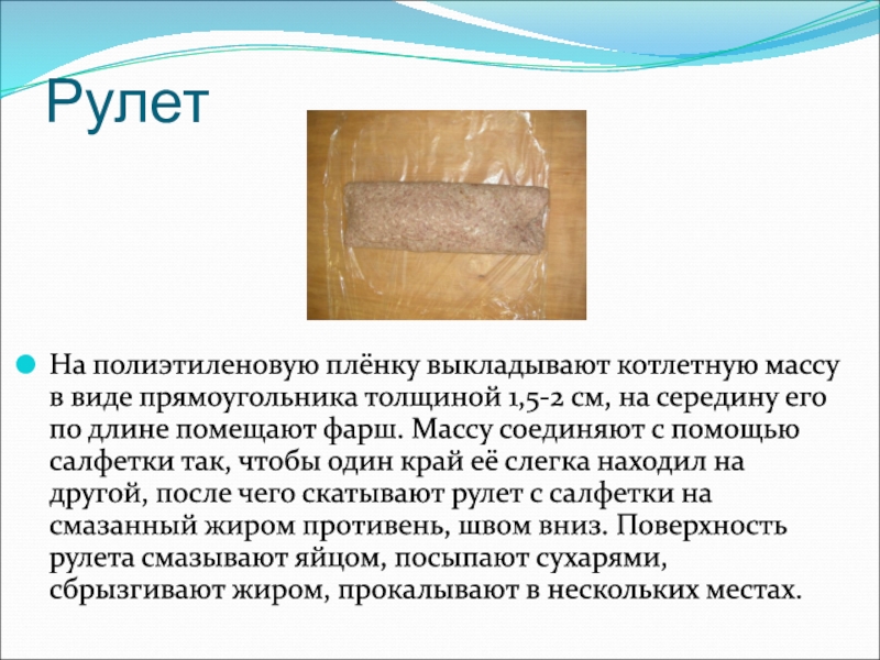 соединяют с помощью салфетки так, чтобы один край её слегка находил на другой, после чего скатывают рулет с салфетки на смазанный жиром противень, швом вниз. Поверхность рулета смазывают яйцом, посыпают сухарями, сбрызгивают жиром, прокалывают в нескольких местах.