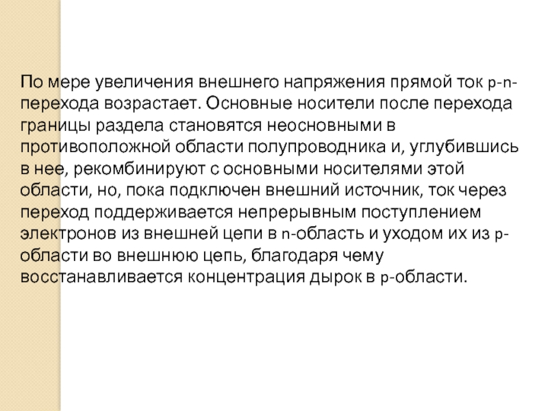 полупроводника и, углубившись в нее, рекомбинируют с основными носителями этой области, но, пока подключен внешний источник, ток через переход поддерживается непрерывным поступлением электронов из внешней цепи в n-область и уходом их из p-области во внешнюю цепь, благодаря чему восстанавливается концентрация дырок в p-области.