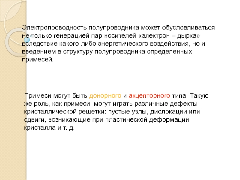 Слайд 7Электропроводность полупроводника может обусловливаться не только генерацией пар носителей «электрон